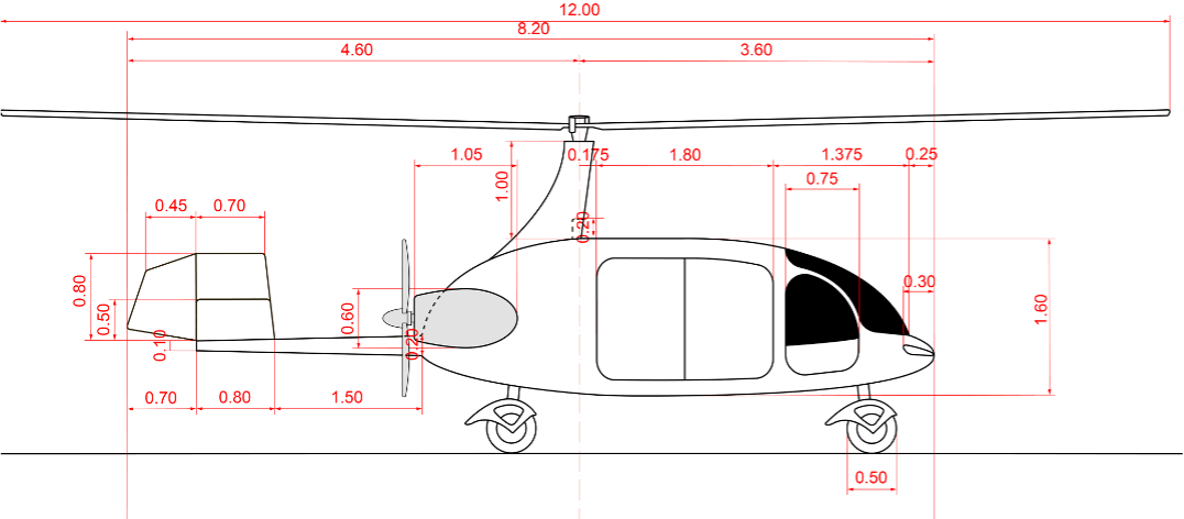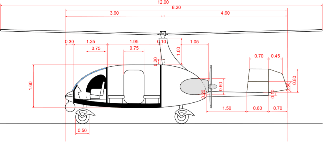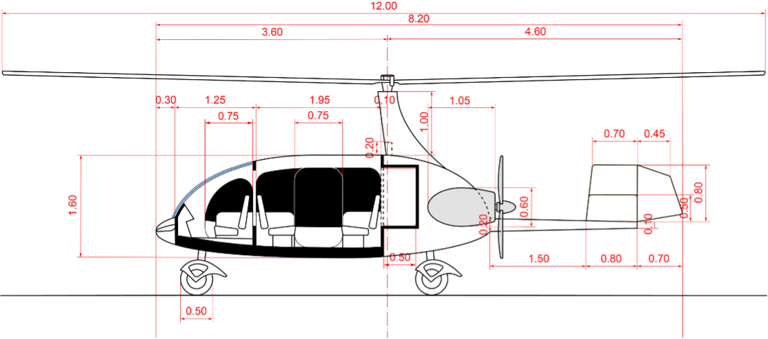 Twin engine gyroplane, conventional propulsion with 2x Rotax 916 iS engines, each with 165hp.