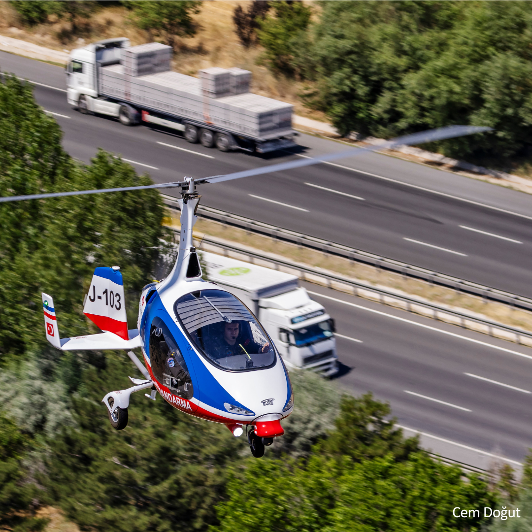 Learn first-hand from Turkish Jandarma Havacilik about the economic advantages and their experience when using AutoGyro gyroplanes instead of helicopters for aerial surveillance tasks. Equipped with cameras and autopilot, our AutoGyro Cavalon Sentinels have proved immensely successful for traffic monitoring and other missions – in a very cost-effective, practical and sustainable manner.
